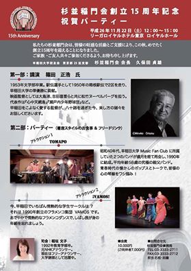 杉並稲門会は、皆様の旺盛な活動とご支援により、この秋、創立15周年を迎えることになりました。ご家族・ご友人共々ご参加くださいますよう、お待ち申し上げます。