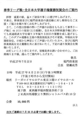 この度、早稲田大学野球部の春季リーグ戦優勝、大学日本一を祝し、次の様に祝賀会を行います。都下、校友会の有志でご参加頂ける方はご連絡ください。